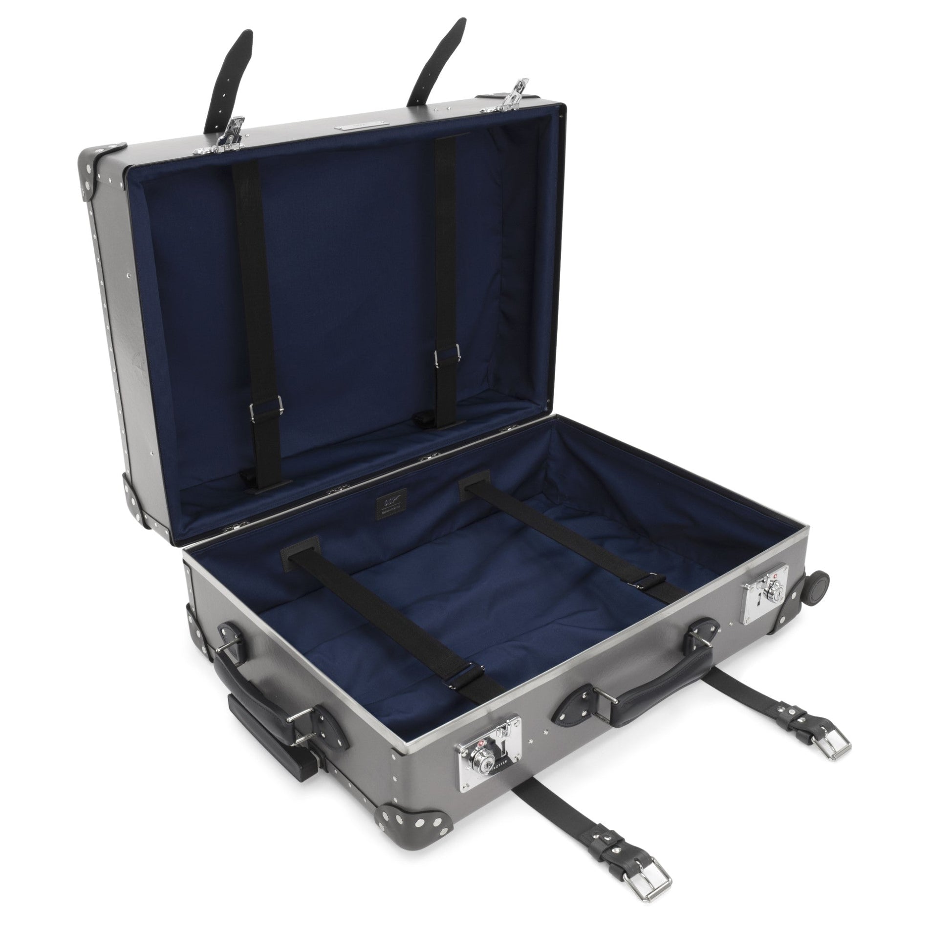 The 007 Large Check-In suitcase, finished in sleek grey graphite and chrome, embodies the spirit of James Bond’s global sophistication.