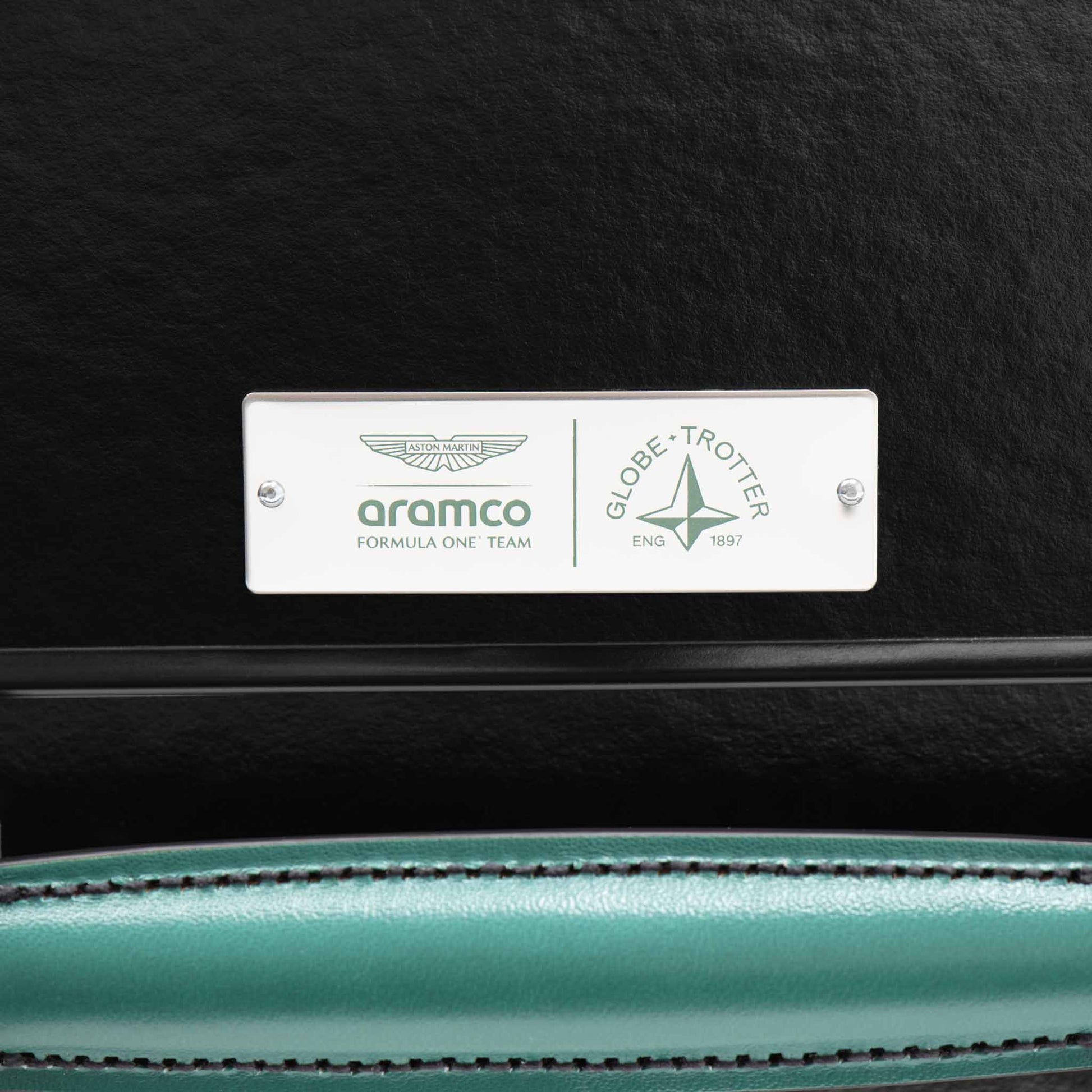Designed with sleek black vulcanised fibreboard and complemented by modern black hardware, this Carry-On exudes understated elegance. The leather corners and handles are finished in Aston Martin Aramco Formula One® Team Podium Green, a perfect match to the AMR25 racing car. A co-branded metal plaque graces the exterior lid, while a leather patch inside showcases its limited-edition number, a mark of exclusivity.