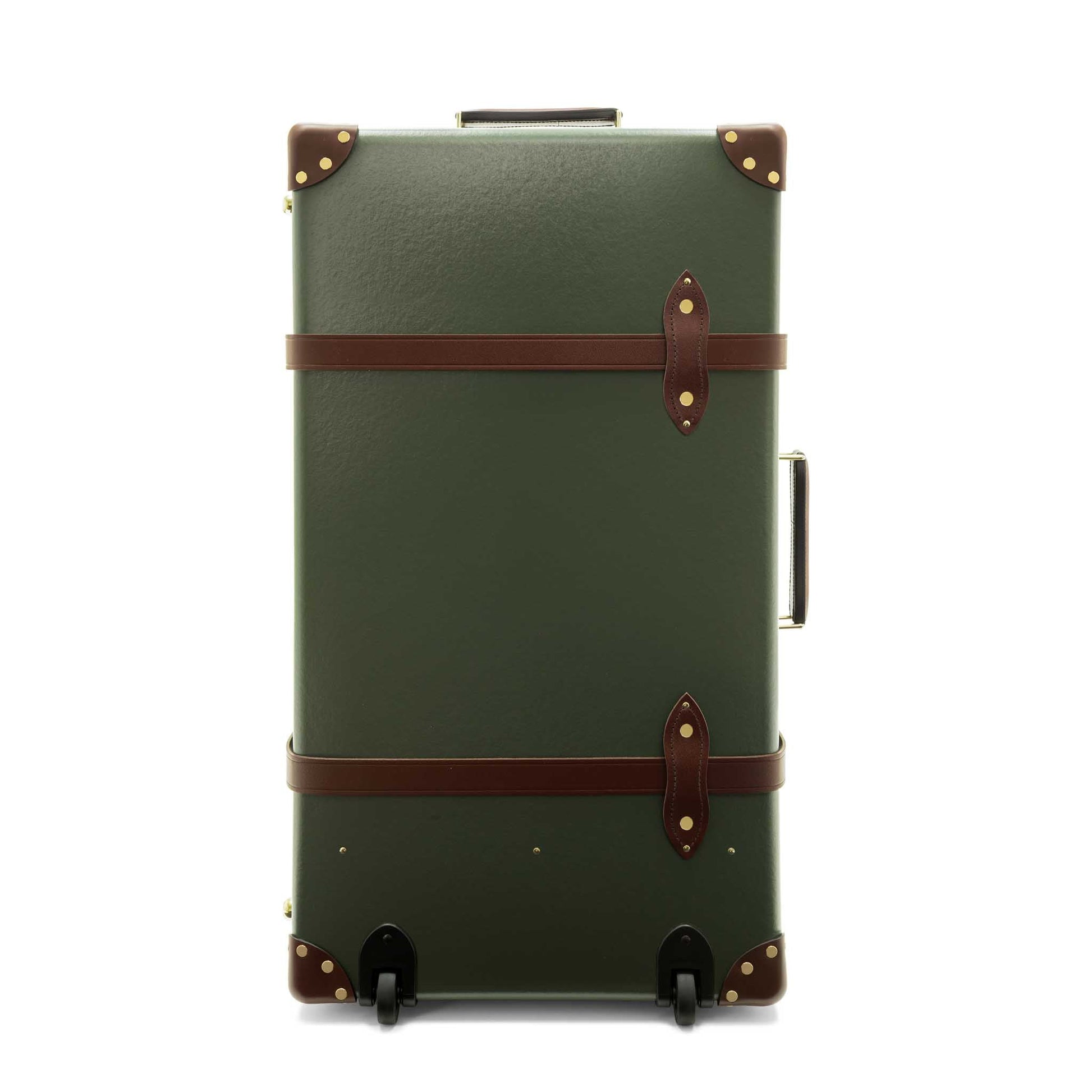 Constructed from Globe-Trotter's signature vulcanised fibreboard, the Large Suitcase is both lightweight and exceptionally durable. The deep forest green exterior is complemented by vegetable-tanned brown leather corners and polished gold-tone hardware, creating a sophisticated aesthetic that stands out in any setting. The absence of a trolley system preserves its classic silhouette, while two smooth-rolling wheels and a sturdy leather handle allow for effortless navigation when needed.