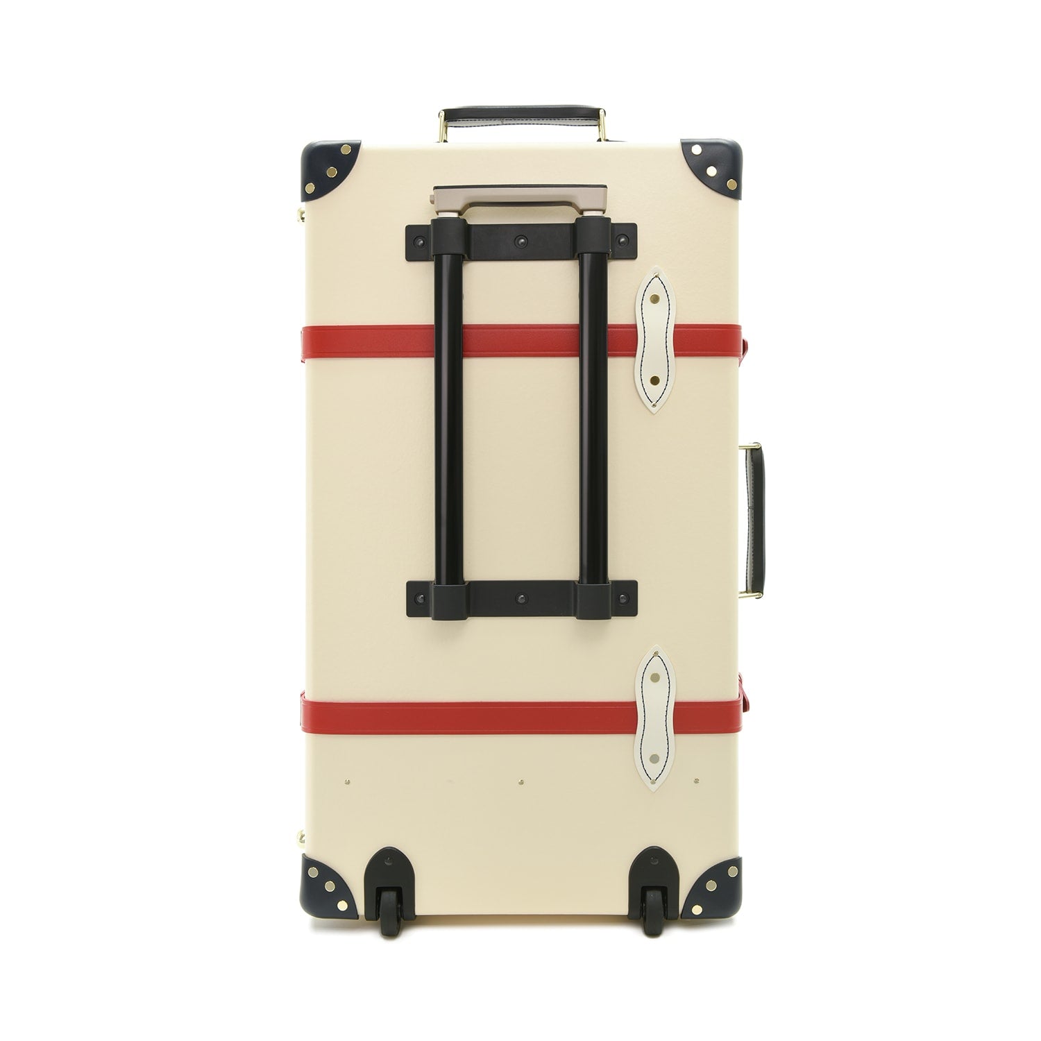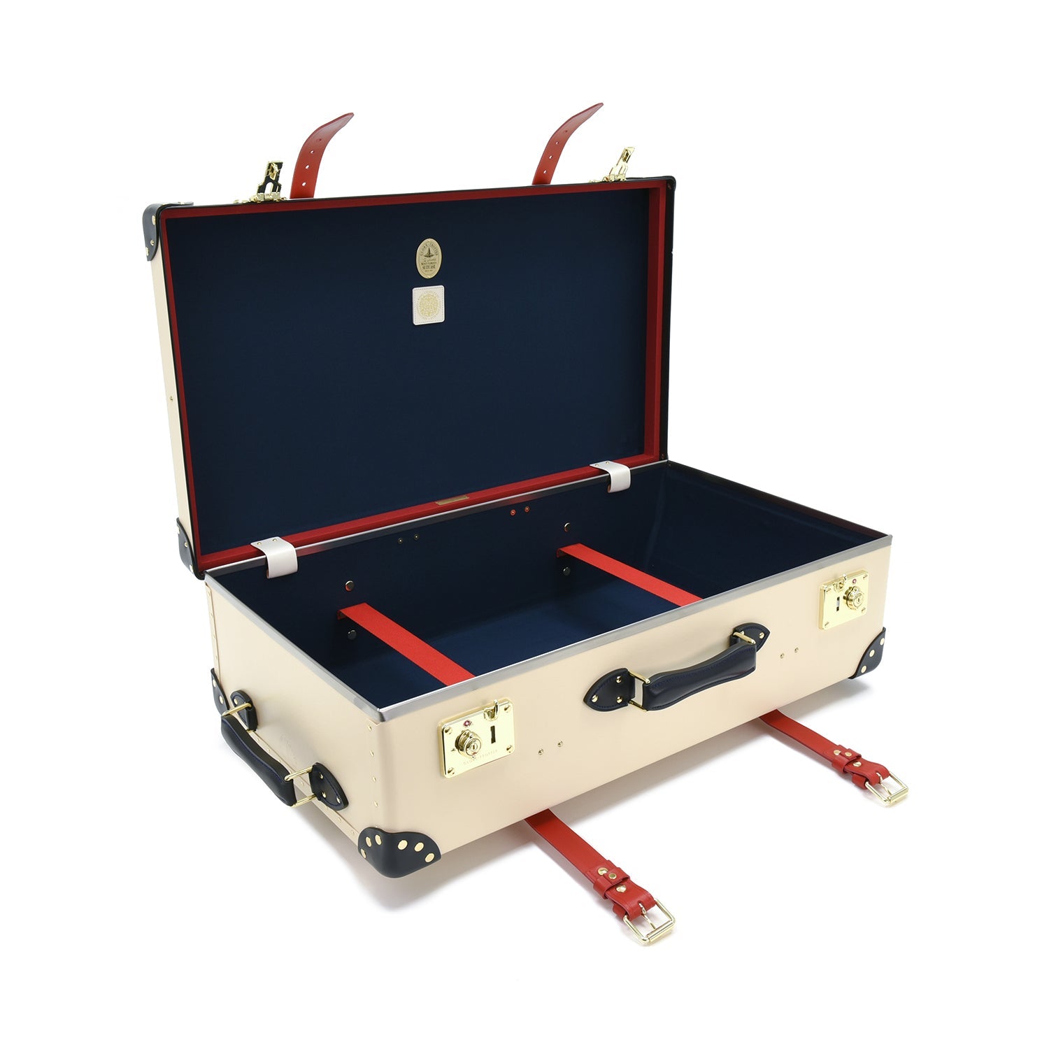 Featuring ivory fibreboard with navy and red leather accents, gold detailing, and an exquisite emblem, it offers regal sophistication and generous storage for longer journeys.